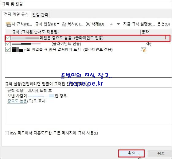 규칙 및 알림 창에, 방금 생성한 규칙을 확인할 수 있습니다. '확인' 을 클릭 합니다.