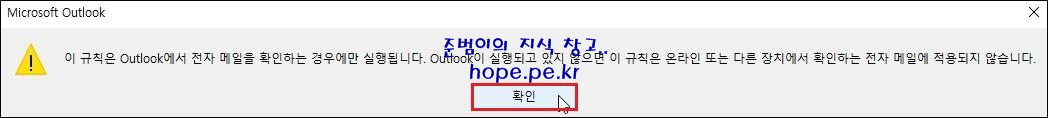 Microsoft Outlook 창에서, 규칙에 대한 주의사항을 인지후 '확인' 을 클릭 합니다.