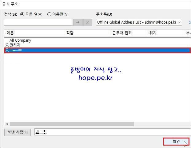 규칙 주소 창에서 '알림 받기를 원하는 조직원' 을 더블 클릭 후 '확인' 을 클릭 합니다.