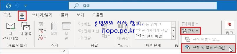 cf) 규칙은 Outlook이 실행되어 있어야만 작동하고, 브라우저나 다른 디바이스에서 확인하는 메일에서는 동작하지 않습니다.