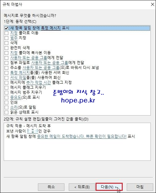 규칙 마법사 창의 첫화면에 있는 규칙을 클릭후 바로 사용해도 되고, '다음' 을 클릭하여 원하는 조건으로 규칙을 생성할 수도 있습니다.