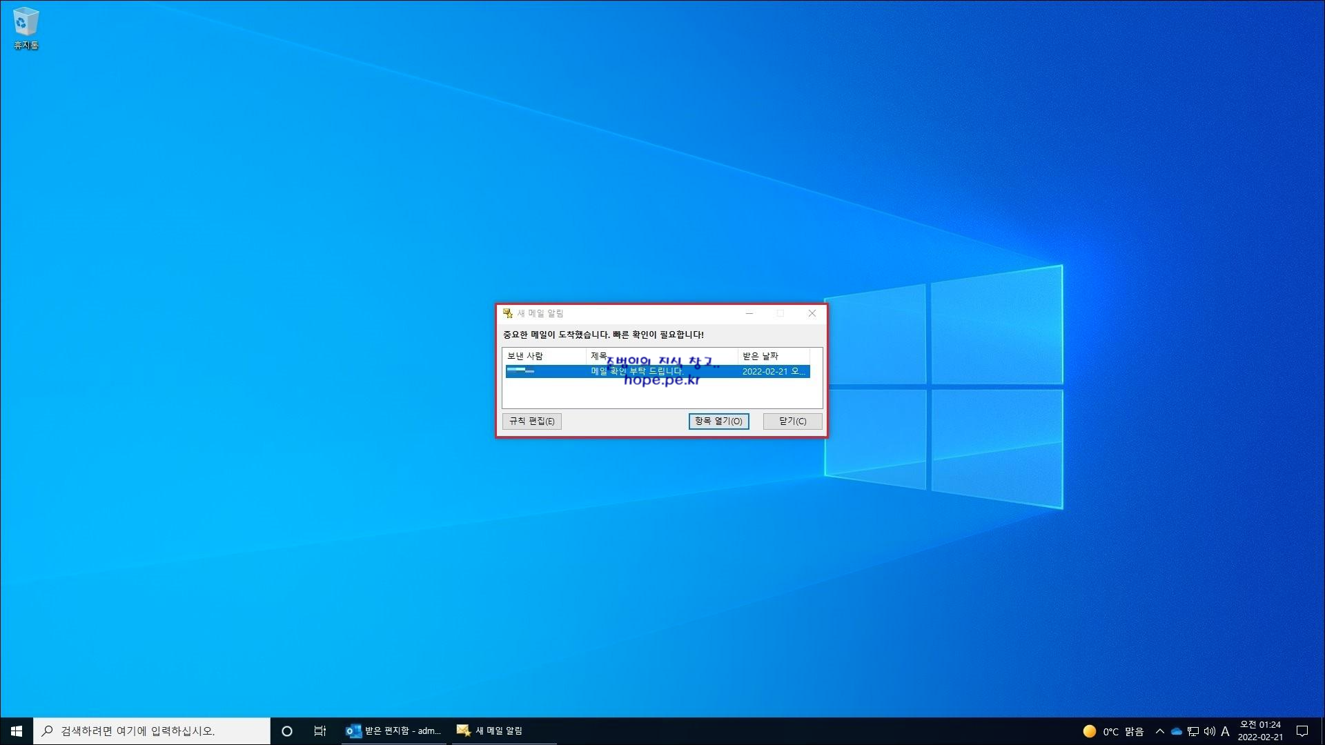 이제 규칙에서 지정한 특정인으로부터 메일을 수신하면 다음과 같이 '새 메일 알림' 창이 표시 됩니다.