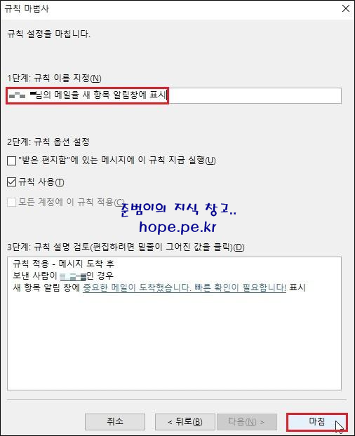 '1단계: 규칙 이름 지정' 에서 규칙의 이름을 그대로 사용하거나 적절한 이름으로 변경후 '마침' 을 클릭 합니다