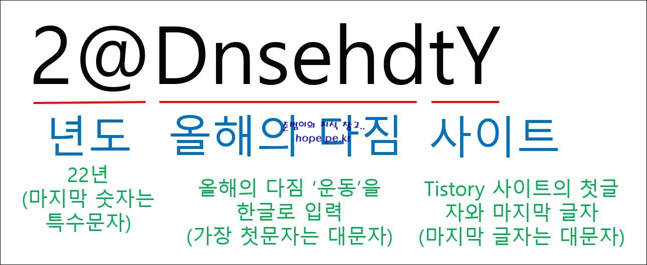 예를 들어, ''22'년도 올해의 다짐인 '운동'과 '티스토리' 사이트의 앞뒤 글자를 조합하여 다음과 같은 패스워드를 사용합니다.