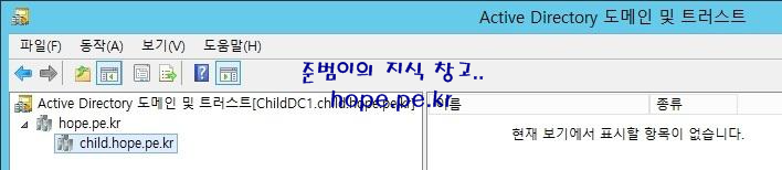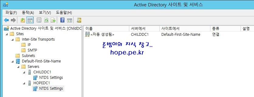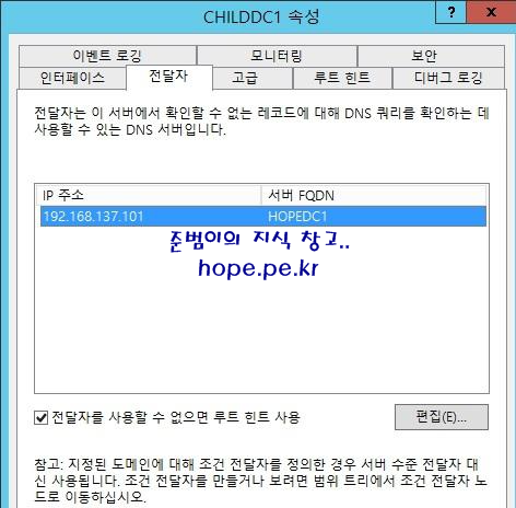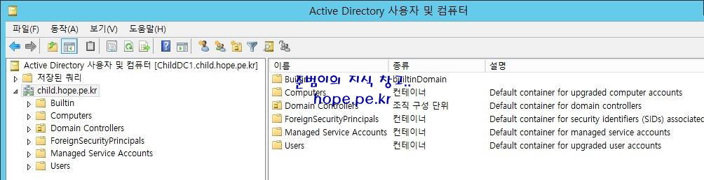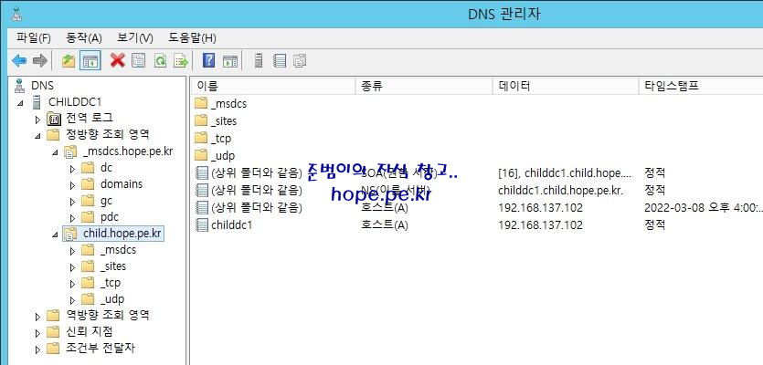 | Child Domain | child.hope.pe.kr | ChildDC1 | 192.168.137.102 | 192.168.137.101 |