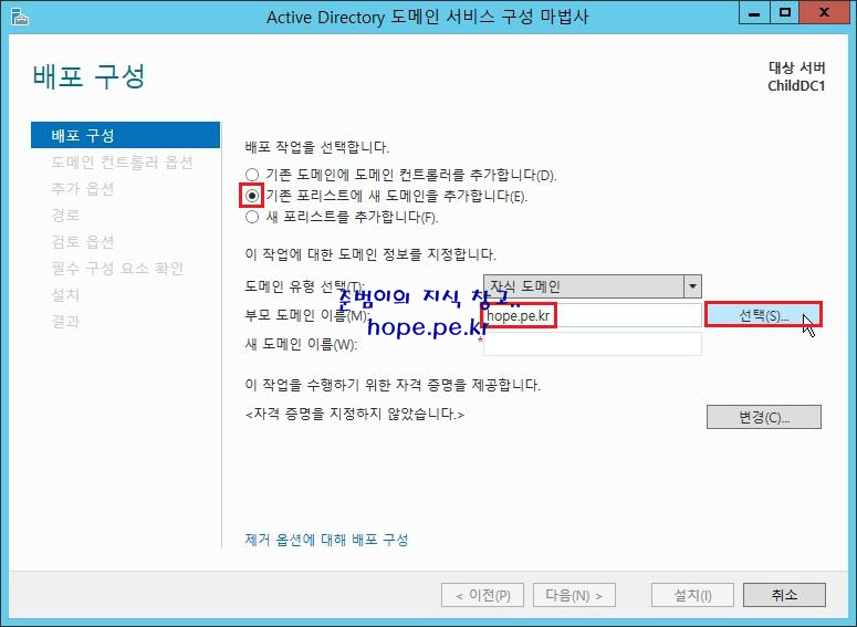 Active Directory 도메인 서비스 구성 마법사 창이 발생합니다. '기존 포리스트에 새 도메인을 추가합니다.' 선택후 '부모 도메인 이름' 입력후 '선택' 을 클릭 합니다.