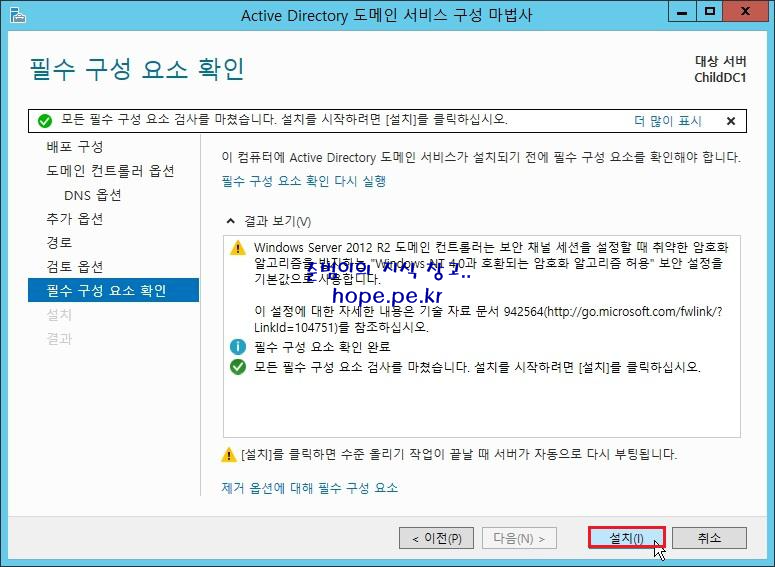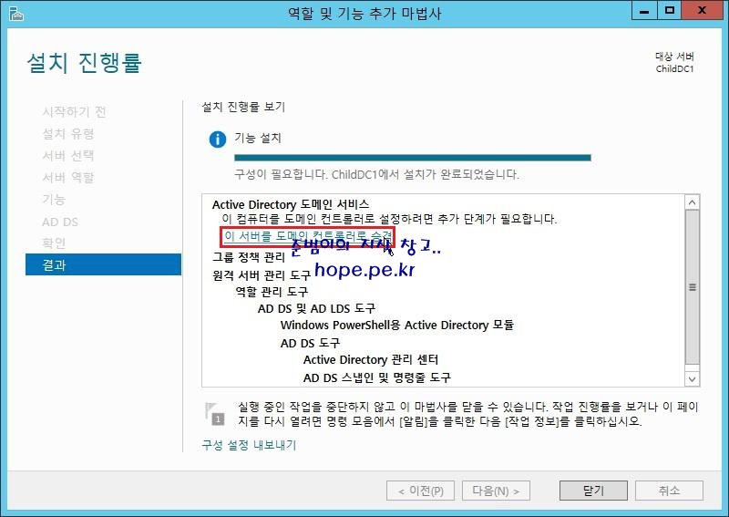 Child Domain의 'Active Directory 도메인 서비스 역할 설치' 과정은 위 포스팅 내용과 동일함으로 위 포스팅의 '3. Active Directory 도메인 서비스 설치'의 '1~14' 단계를 참고 부탁 드리고 '도메인 컨트롤러로 승격' 과정부터 설명 드리겠습니다.