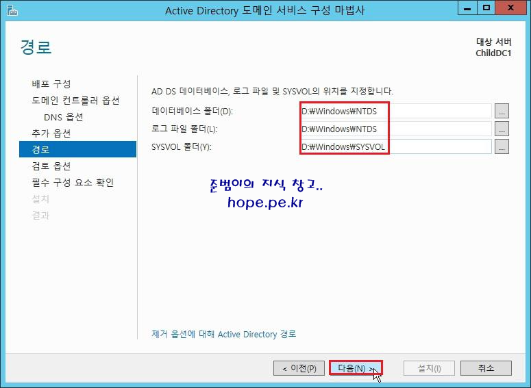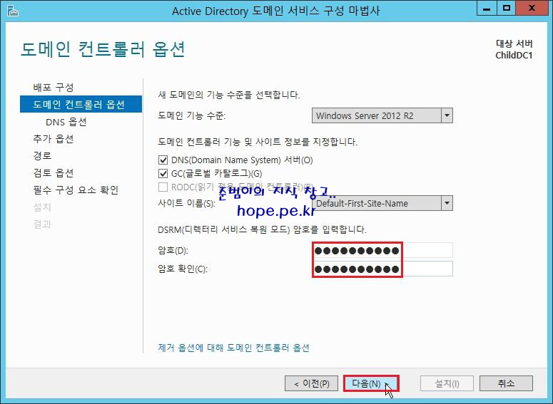 도메인 컨트롤러 옵션 화면에서, 'DSRM(디렉터리 서비스 복원 모드) 암호' 입력후 '다음' 을 클릭 합니다.
