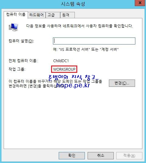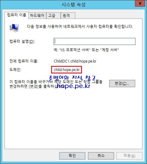 시스템 속성 창에서, '도메인' 이 지정한 Child Domain 이름 잘 생성되었음을 확인합니다.