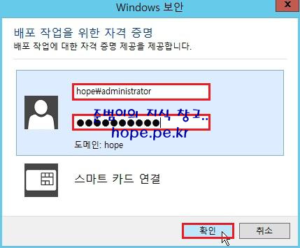 Windows 보안 창에서, 'Root Domain 관리자 계정 정보' 입력후 '확인' 을 클릭 합니다.