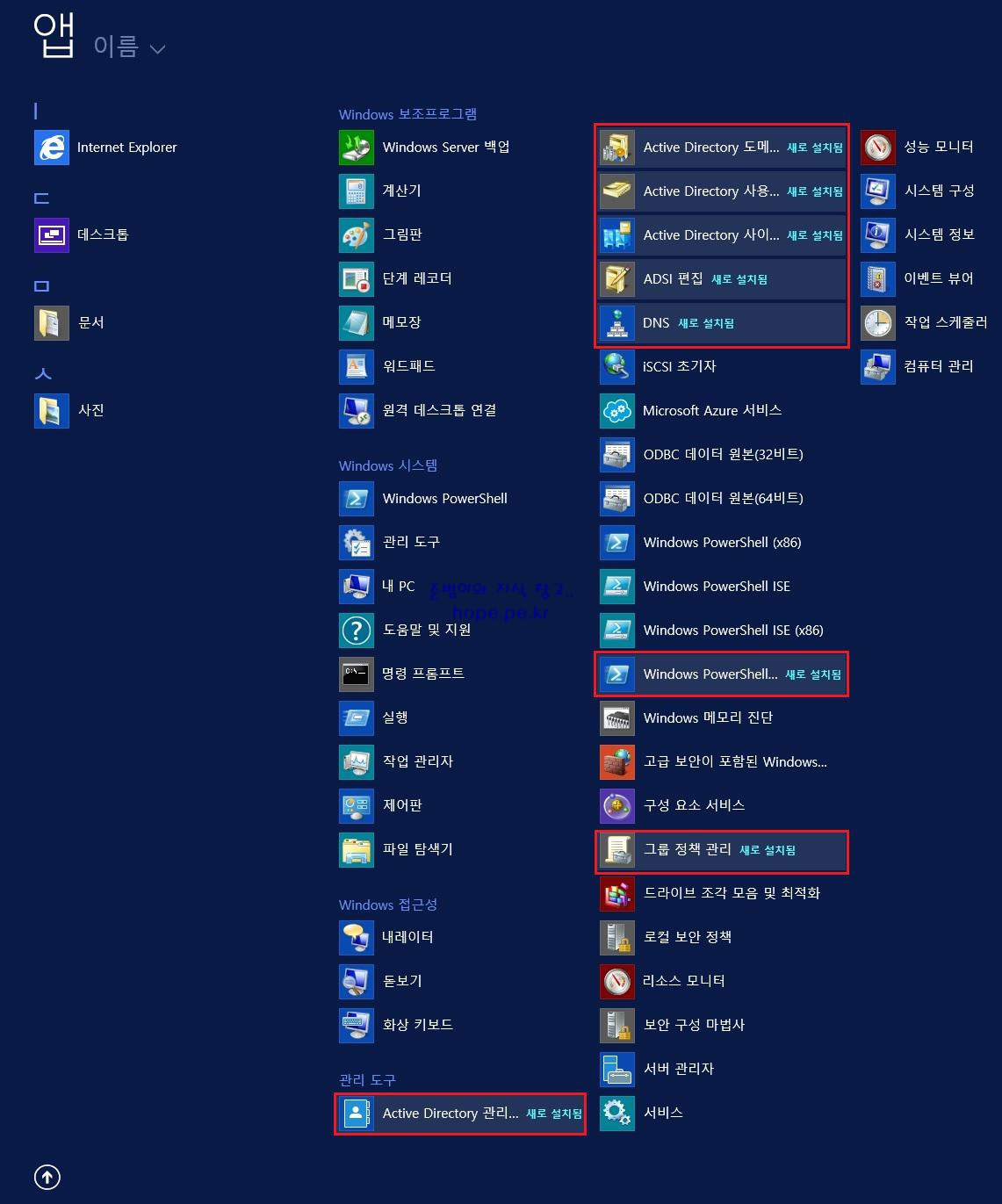 시작 화면을 보면 Active Directory 도메인 서비스 관련 콘솔들이 보입니다.