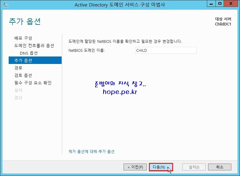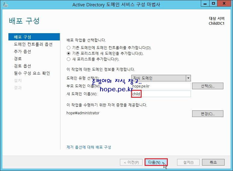 '자식 도메인 이름' 입력후 '다음' 을 클릭 합니다.