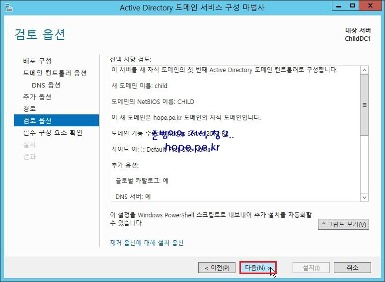 검토 옵션 화면에서, '다음' 을 클릭 합니다.