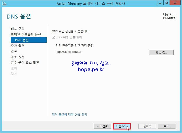 DNS 옵션 화면에서, '다음' 을 클릭 합니다.