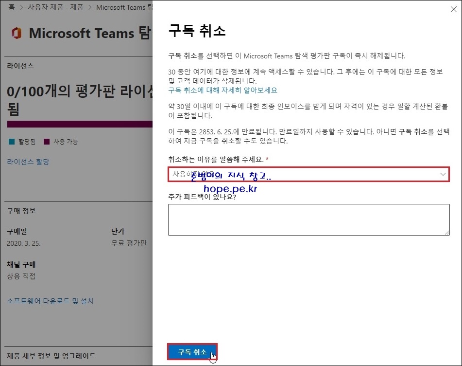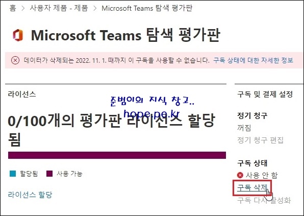 Microsoft Teams 탐색 평가판 페이지에서, '구독 취소' 를 클릭 합니다.
