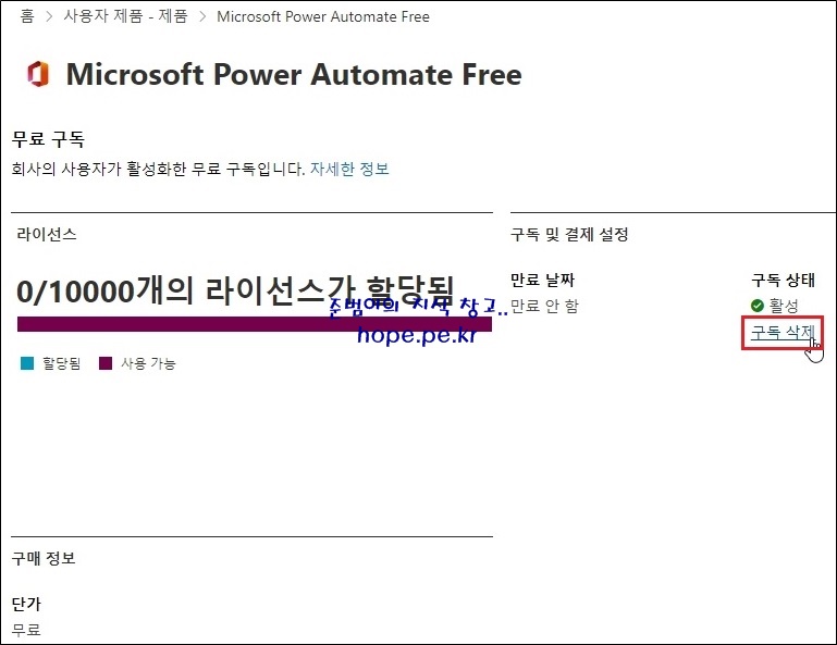 Microsoft Power Automate Free 페이지에서, '구독 삭제' 를 클릭 합니다.