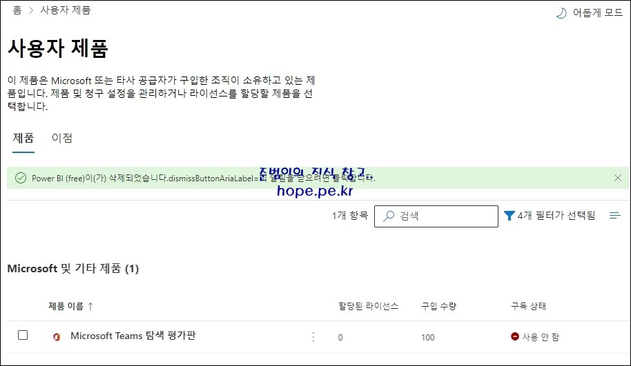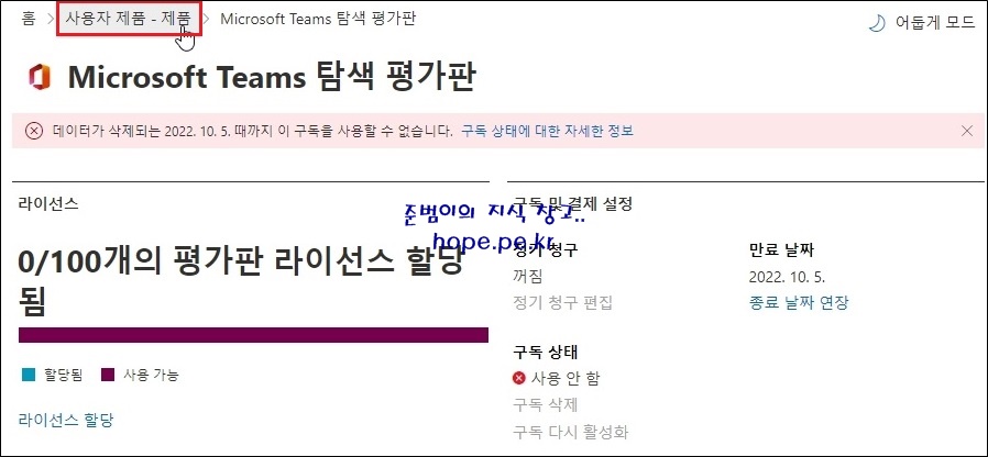 사용자 제품 페이지에서, 남아 있는 사용자 제품을 위와 동일한 과정으로 '구독 취소' 및 '구독 삭제' 를 진행 합니다.