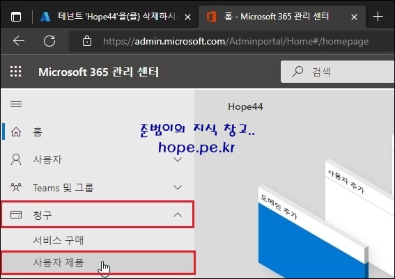 'Microsoft 365 관리 센터' 접속후 '청구 > 사용자 제품' 을 클릭 합니다.