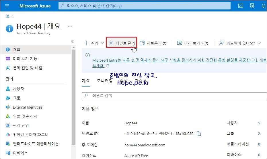 테넌트 개요 페이지에서, '테넌트 관리' 를 클릭 합니다.