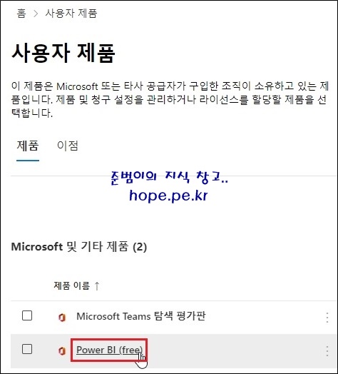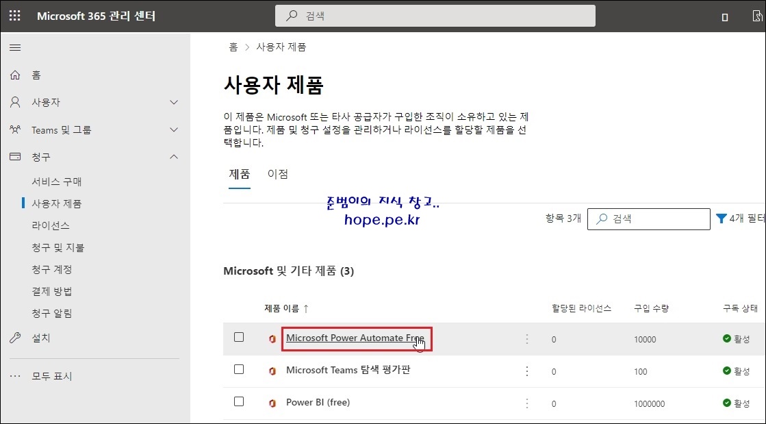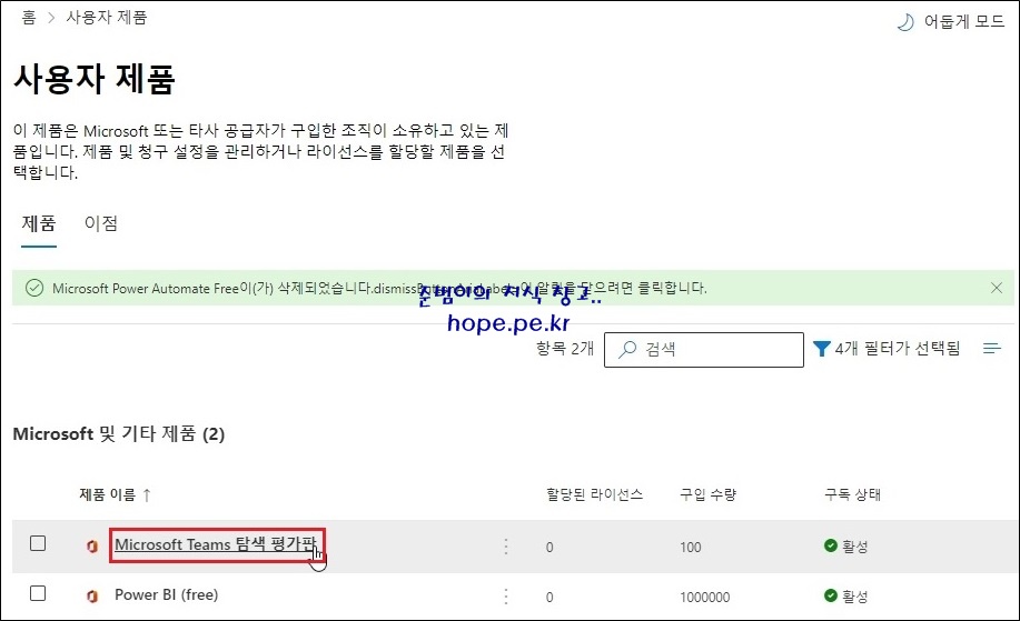 사용자 제품 페이지에서, 존재하는 모든 사용자 제품을 삭제를 해야 합니다. 'Microsoft Power Automate Free' 를 클릭 합니다.
