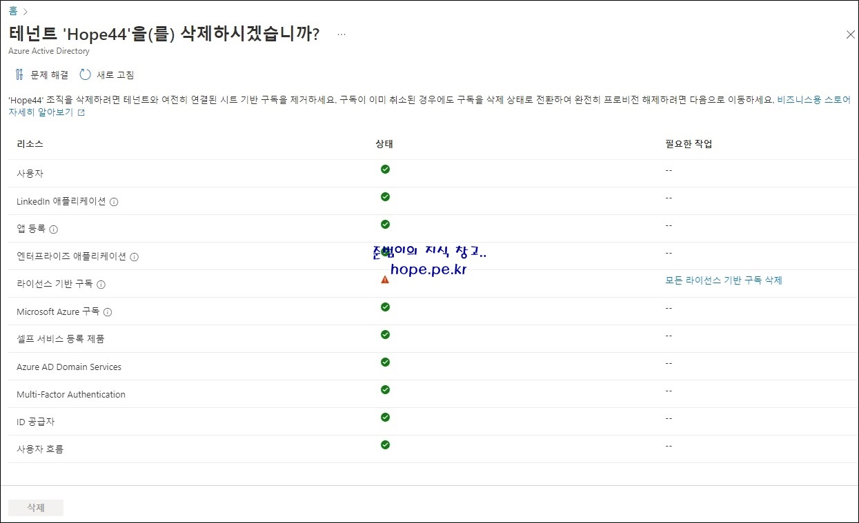 테넌트 'Tenant Name'을(를) 삭제하시겠습니까? 페이지를 확인하면, '라이선스 기반 구독' 리소스만 검사를 통화하면 되네요. 해당 작업은 위에서 언급 했듯이 72시간(3일)의 기간이 필요합니다.
