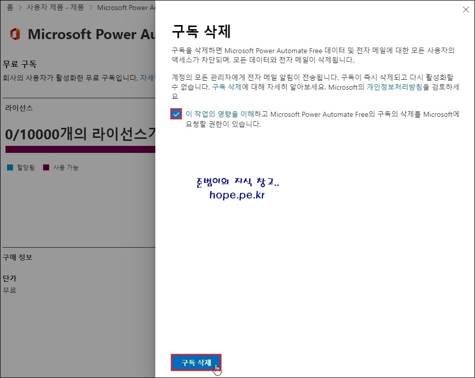 구독 삭제 화면에서, '이 작업의 영향을 이해하고 Microsoft Power Automate Free의 구독의 삭제를 Microsoft에 요청할 권한이 있습니다.' 에 체크후 '구독 삭제' 를 클릭 합니다.