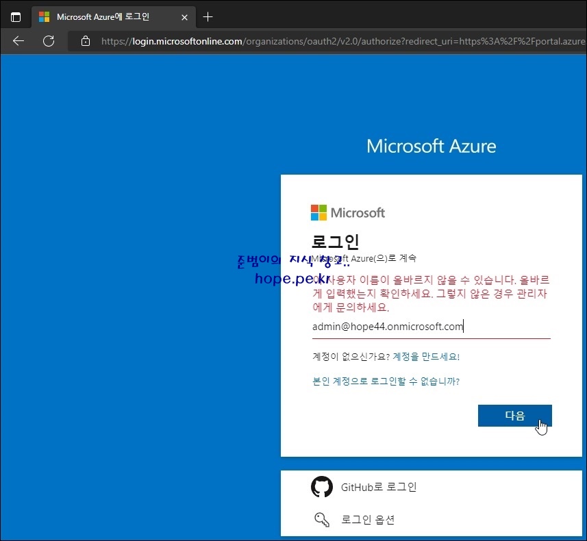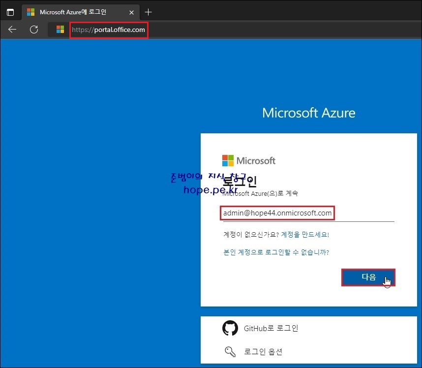 웹브라우저에서, Azure 포탈 사이트(https://portal.azure.com)에 접속후, 전역 관리자 계정으로 로그인을 진행 합니다.