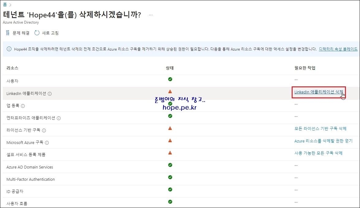 '필요한 작업' 열에서, 테넌트 삭제를 진행하기 위한 자세한 정보가 포함된 링크들이 제공됩니다. 해당 링크들을 클릭하여 테넌트 삭제를 위한 검사 항목들을 모두 통과해야 합니다.