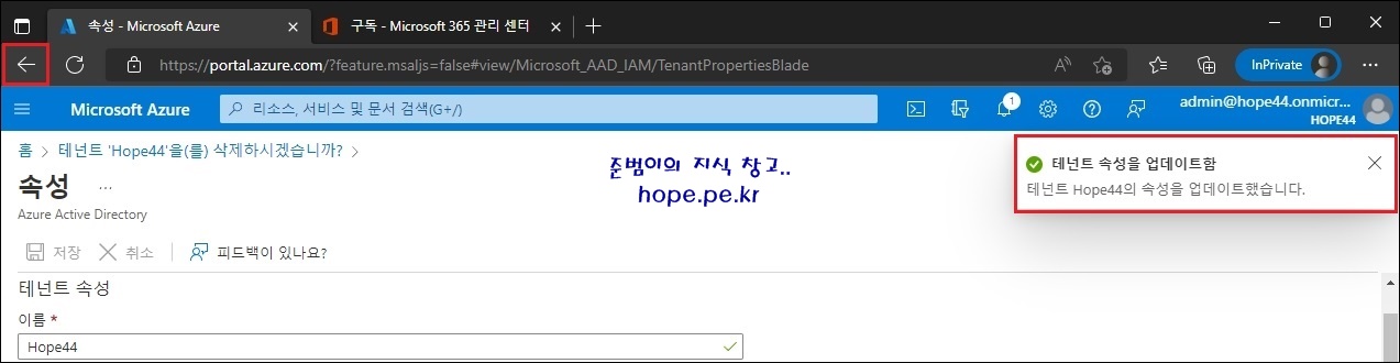 '테넌트의 속성을 업데이트함' 메세지 확인후 '뒤로 가기' 버튼을 클릭 합니다.