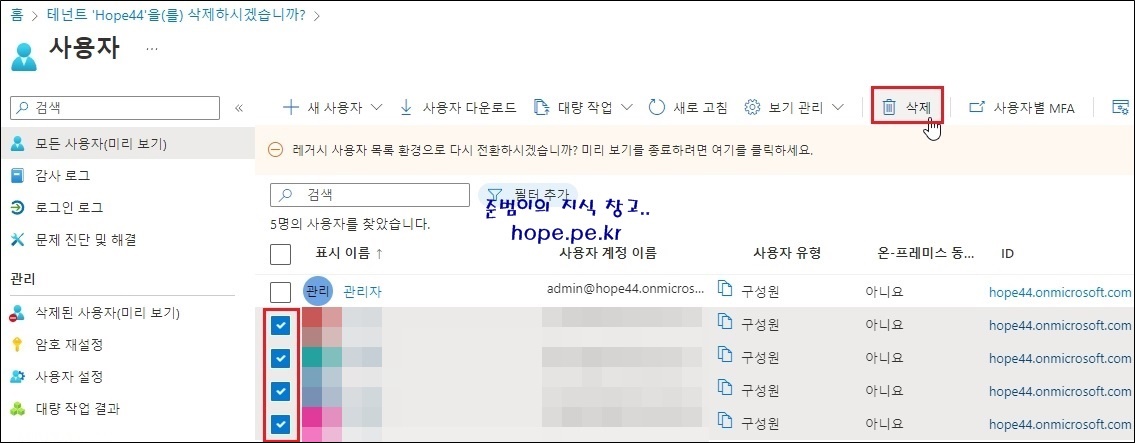 그럼 바로 사용자를 삭제할 수 있는 '사용자' 페이지로 이동이 됩니다. 전역 관리자를 제외한 사용자를 모두 선택후 '삭제' 를 클릭 합니다.