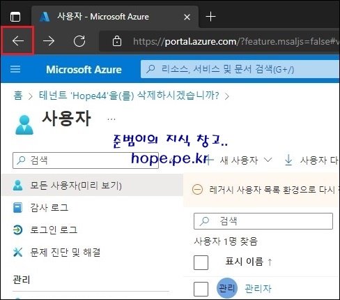 사용자 삭제가 완료되면 웹브라우저의 '뒤로 가기' 버튼을 클릭 합니다.