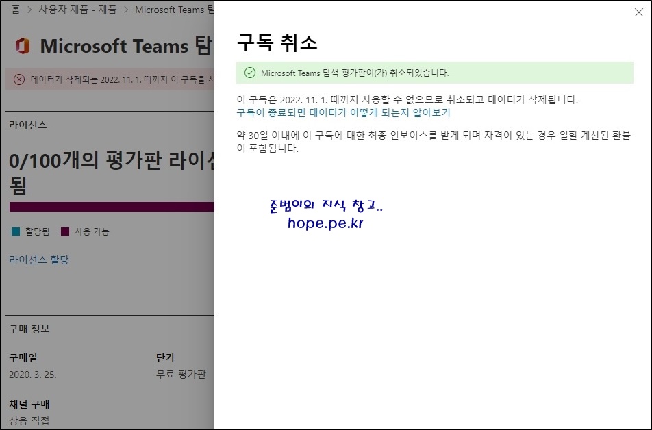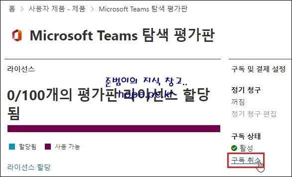 Microsoft Teams 탐색 평가판 페이지에서, '구독 취소' 를 클릭 합니다.