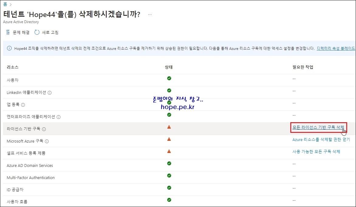 이번에는 모든 라이선스 기반 구독 삭제를 진행할 수 있는 페이지로 바로 연결되는게 아니라, 해당 작업을 진행하는데 참고할 수 있는 사이트가 새 탭으로 열립니다.