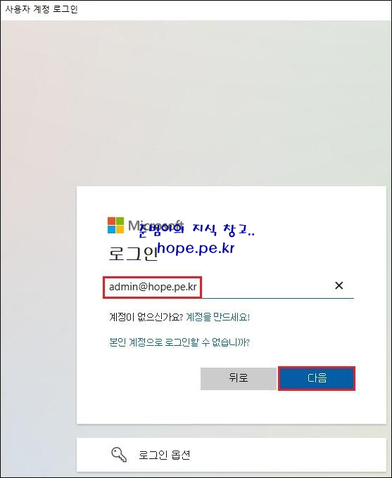 사용자 계정 로그인 창의 로그인 화면에서, '관리자 계정' 입력후 '다음' 을 클릭 합니다.