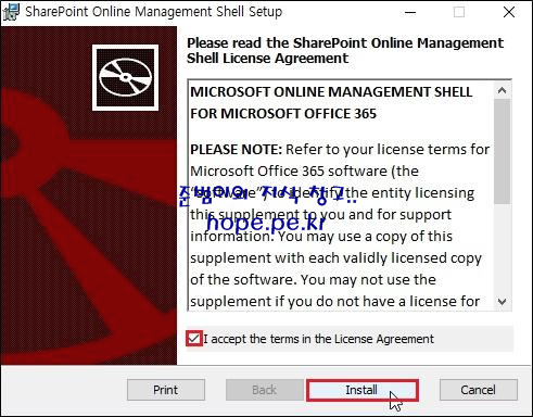 SharePoint Online Management Shell Setup 창이 실행되면 Please read the SharePoint Online Management Shell K License Agreement 화면에서, 'I Accept the terms in the License Agreement' 선택후 'Instll' 을 클릭 합니다.