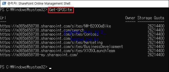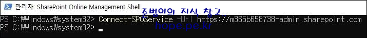 관리자: SharePoint Online Management Shell 창이 실행되면, 다음 cmdlet 을 실행 합니다.