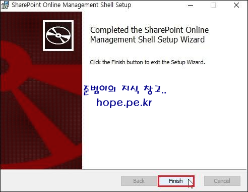 Completed the SharePoint Online Management Shell Setup Wizard 화면에서, 'Finish' 를 클릭 합니다.