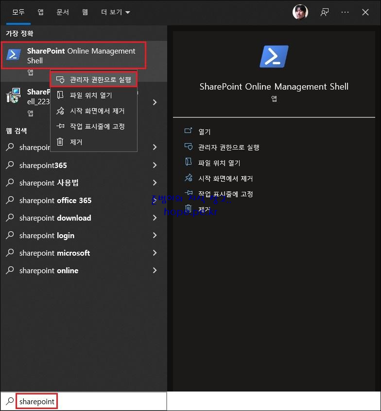 Windows 검색창에 'sharepoint' 입력후 검색되는 'SharePoint Online Management Shell' 에서 우클릭후 '관리자 권한으로 실행' 을 클릭 합니다.