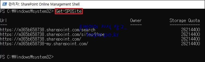 cf) 연결하는 방법은 'SharePoint Online 관리 셸 시작하기' 포스팅을 참고 부탁 드립니다.