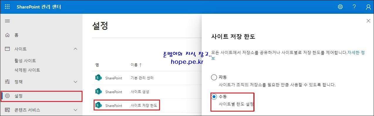 그리고 StorageQuota 매개변수는 'SharePoint 관리 센터 > 설정 > SharePoint 사이트 저장 한도' 가 수동으로 설정되어 있어야 지정이 가능하고