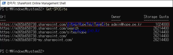 다시 Get-SPOSite cmdlet 을 실행하여 방금 생성한 사이트를 확인 합니다.