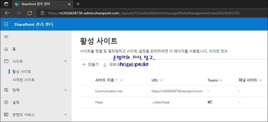 'SharePoint 관리 센터 > 사이트 > 활성 사이트' 에서도 생성되어 있는 사이트 목록을 확인할 수 있습니다.