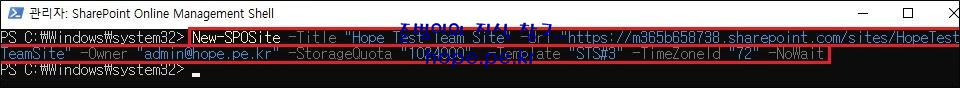 ex) New-SPOSite -Title "Hope Test Team Site" -Url "https://m365b658738.sharepoint.com/sites/HopeTestTeamSite" -Owner "admin@hope.pe.kr" -StorageQuota "1024000" -Template "STS#3" -TimeZoneId "72" -NoWait
