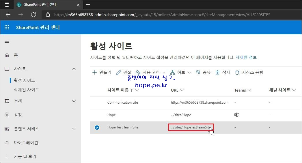 'SharePoint 관리 센터 > 사이트 > 활성 사이트' 에서도 방금 생성한 사이트를 확인할 수 있습니다. '사이트 URL' 을 클릭 합니다.
