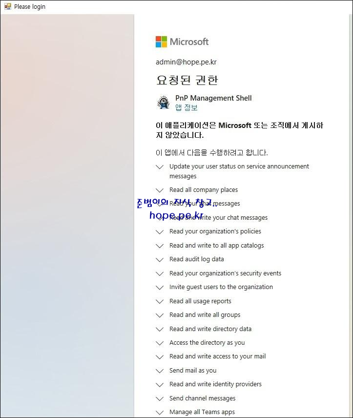 cf) PnP Management Shell 앱을 등록하고 테넌트에 대한 액세스 권한을 부여하지 않고 연결 시도를 진행하면 다음과 같은 에러가 발생 합니다.