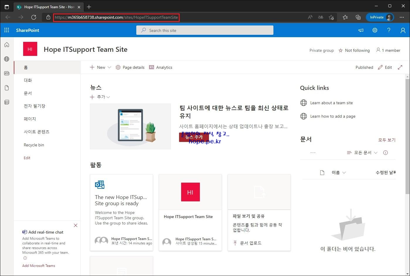 해당 팀사이트에 잘 생성 되었는지 접속해보겠습니다. 잘~ 만들어졌습니다.