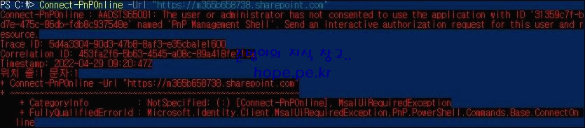 cf) PnP Management Shell 앱을 등록하고 테넌트에 대한 액세스 권한을 부여하지 않고 연결 시도를 진행하면 다음과 같은 에러가 발생 합니다.