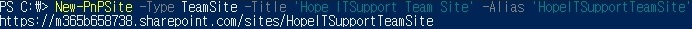 ex) New-PnPSite -Type TeamSite -Title 'Hope ITSupport Team Site' -Alias 'HopeITSupportTeamSite'