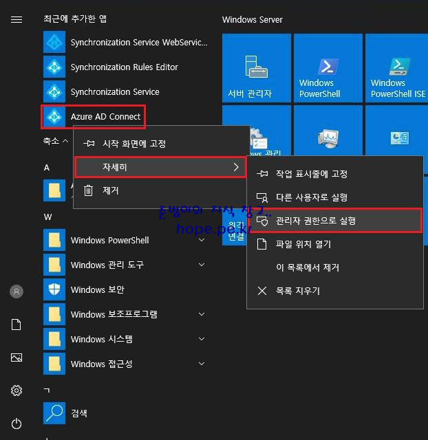 TO-BE Azure AD Connect 서버에서, ‘시작 > Azure AD Connect’ 에서 우클릭후 '자세히 > 관리자 권한으로 실행' 을 클릭 합니다.
