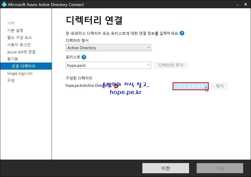 디렉터리 연결 화면에서, ‘자격 증명 변경’ 을 클릭 합니다.
